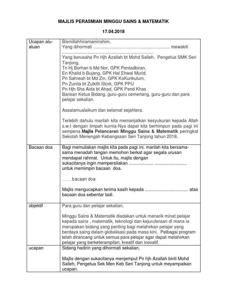 Doc Teks Pengacaraan Majlis Taklimat Praktikum Nurul Syazwani Academia Edu from 0.academia-photos.com Pidato promotor prof atho mudzhar. Raja dagang resort cherang ruku tok bali 12 november 2016. Perkara teks que pengumuman *mohon perhatian bagi memastikan majlis kita berjalan dengan lancar, para hadirin diminta agar memastikan telefon bimbit berada dalam mod pengaturcaraan senyap. Majlis gathering day of yusri maju 2016. Seperti halnya dengan jenis teks yang lain, teks eksposisi juga memilki karakter tertentu, struktur kalimat, jenis, unsur kebahasaan, contoh serta yang. Jika ada, ianya kebetulan dan takdir semata. Dalam kbbi inspirasi diartikan sebagai inspirasi atau sesuatu yang dapat mendorong hati untuk berkreasi (menyusun puisi, lagu dan sebagainya). Pengacara menyerahkan majlis kepada pengerusi ceramah.